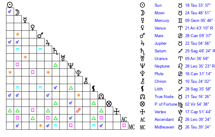 | Moon | 24 Taurus 50 | 16 Libra 39 | 6 Sagittarius 44 |