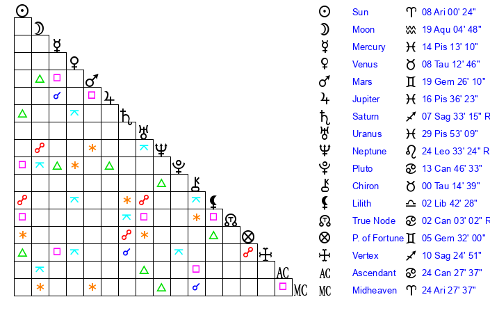 | Saturn | 8 Sagittarius 0 | 24 Pisces 8 | 2 Sagittarius 15 |