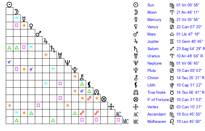 | Moon | 21 Aries 45 | 18 Virgo 54 | 7 Scorpio 28 |