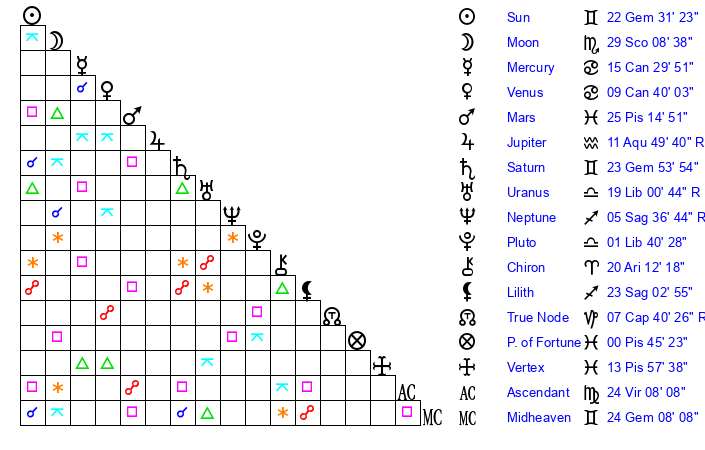 | Sun | 22 Gemini 31 | 22 Gemini 56 | 12 Leo 9 |