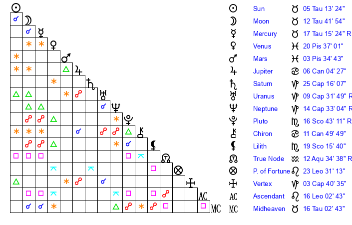 | Sun | 5 Taurus 13 | 5 Taurus 44 | 9 Gemini 1 |