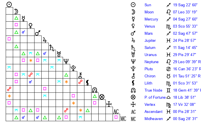 | Saturn | 11 Sagittarius 37 | 25 Pisces 15 | 19 Sagittarius 26 |