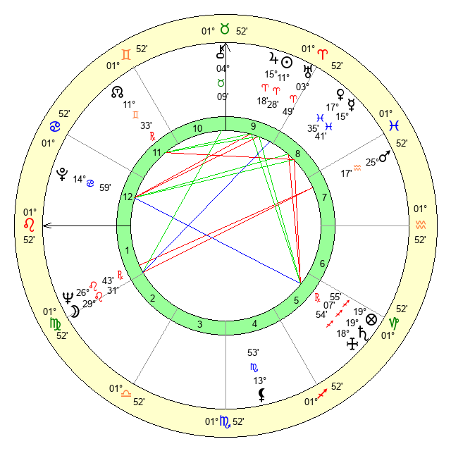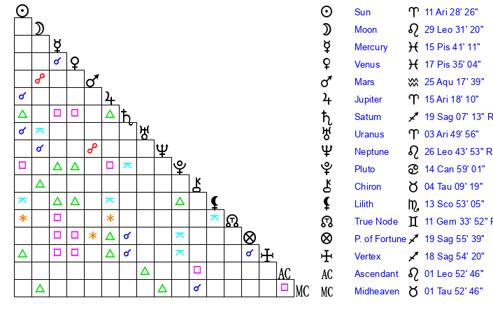 | Moon | 29 Leo 29 | 24 Taurus 10 | 6 Pisces 23 |