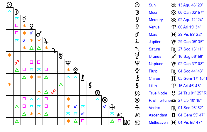 | Mercury | 2 Aquarius 13 | 9 Aquarius 15 | 12 Aries 5 |