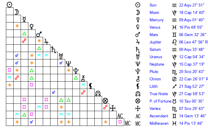 | Saturn | 0 Aquarius 35 | 18 Pisces 33 | 4 Aquarius 2 |