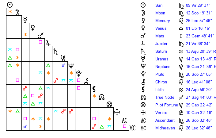 | Mercury | 26 Leo 58 | 28 Leo 23 | 25 Libra 49 |