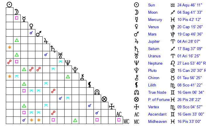 | Sun | 24 Aquarius 46 | 26 Aquarius 15 | 0 Gemini 22 |
