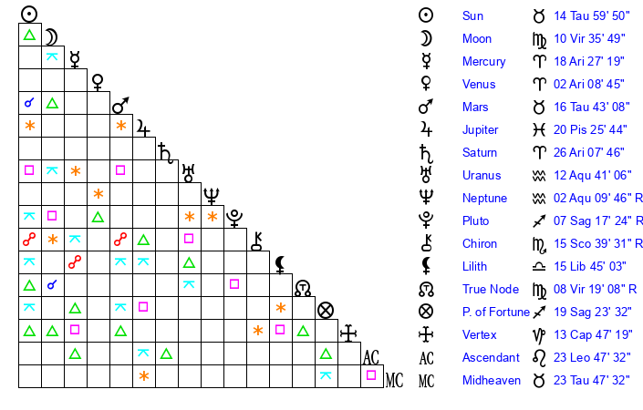 | Sun | 15 Taurus 0 | 15 Taurus 27 | 11 Gemini 0 |