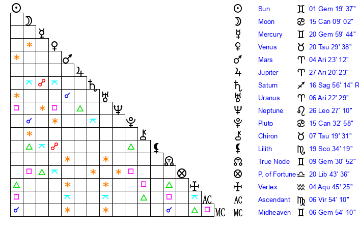 | Sun | 1 Gemini 19 | 1 Gemini 51 | 4 Virgo 9 |