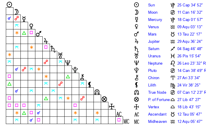 | Moon | 11 Cancer 12 | 0 Virgo 4 | 0 Aquarius 39 |