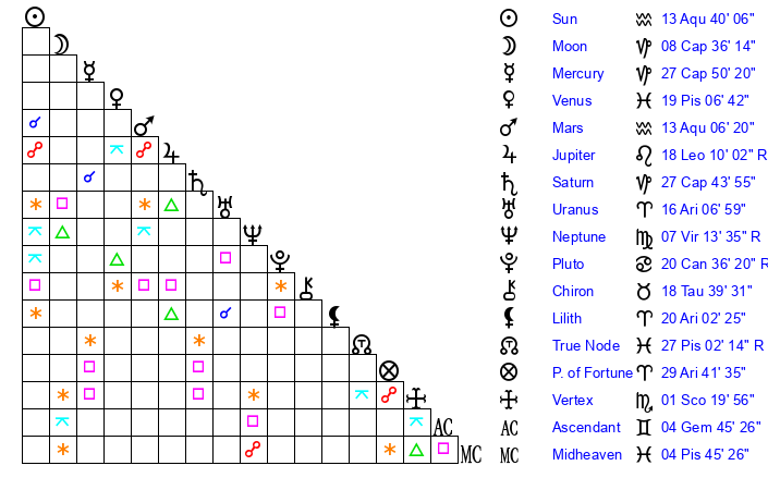 | Mercury | 27 Capricorn 51 | 10 Aquarius 56 | 19 Aries 45 |