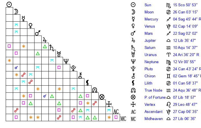 | Sun | 15 Scorpio 51 | 16 Scorpio 32 | 19 Aquarius 15 |