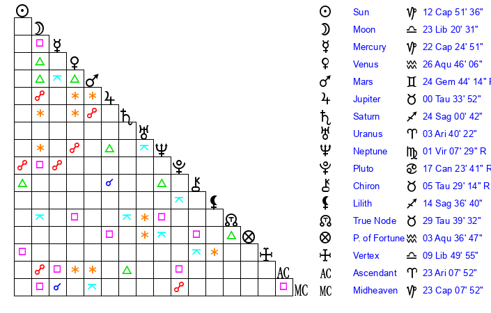 | Moon | 23 Libra 22 | 17 Cancer 21 | 1 Taurus 37 |