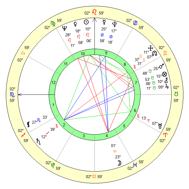 | Moon | 23 Aquarius 6 | 23 Scorpio 31 | 22 Virgo 35 |