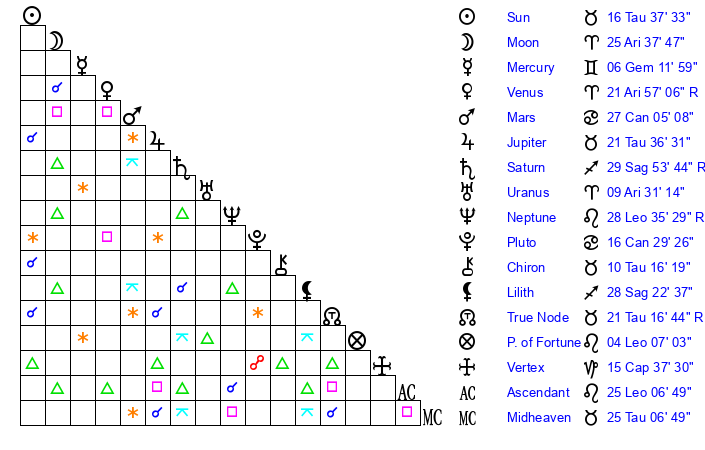 | Moon | 25 Aries 37 | 22 Virgo 58 | 12 Scorpio 32 |