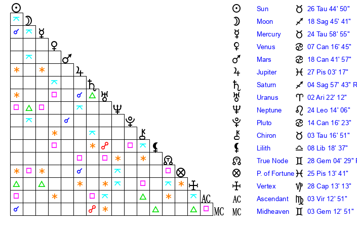 | Mercury | 25 Taurus 0 | 14 Taurus 54 | 21 Leo 34 |