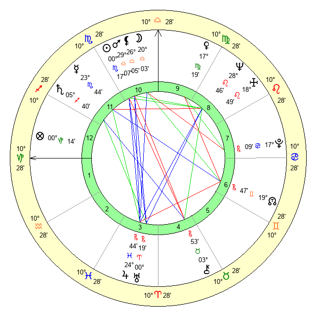 | Moon | 20 Libra 5 | 6 Sagittarius 19 | 21 Taurus 26 |