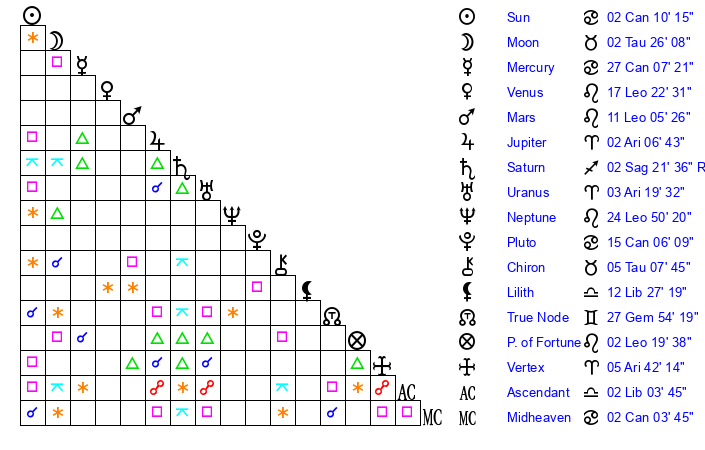 | Sun | 2 Cancer 10 | 3 Cancer 26 | 6 Libra 32 |