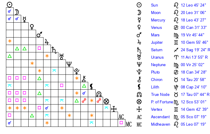 | Moon | 20 Leo 31 | 29 Sagittarius 56 | 18 Aquarius 8 |