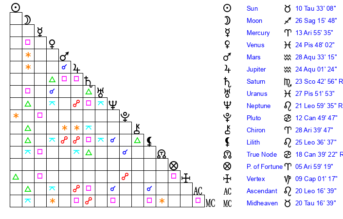 | Saturn | 24 Scorpio 15 | 27 Pisces 50 | 20 Scorpio 6 |