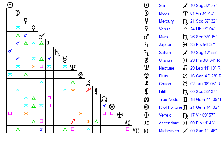 | Mercury | 21 Scorpio 58 | 21 Scorpio 58 | 26 Aquarius 16 |