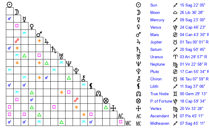 | Saturn | 21 Sagittarius 11 | 25 Pisces 8 | 0 Capricorn 17 |