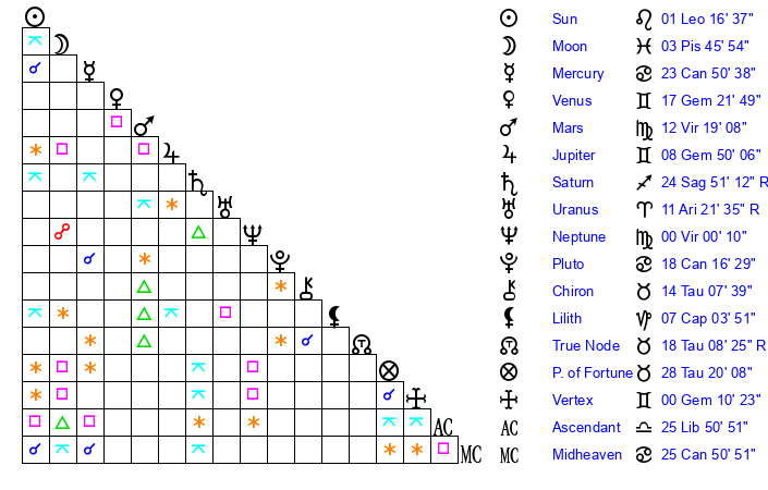 | Pluto | 18 Cancer 17 | 2 Aquarius 35 | 19 Cancer 37 |