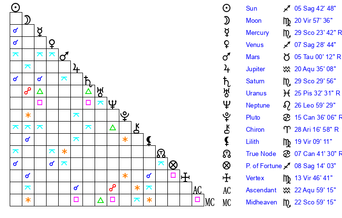 | Sun | 5 Sagittarius 43 | 6 Sagittarius 43 | 16 Pisces 8 |