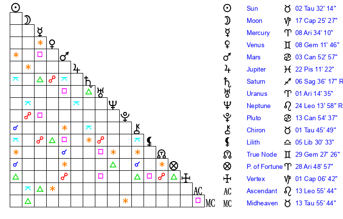 | Moon | 17 Capricorn 22 | 6 Pisces 54 | 29 Leo 36 |