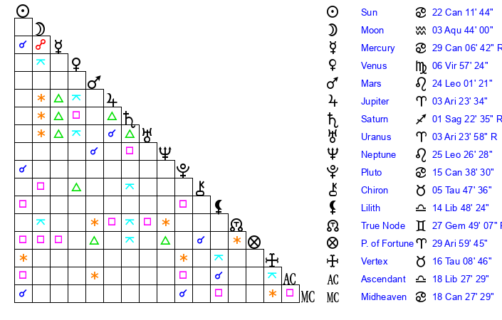 | Pluto | 15 Cancer 39 | 2 Aquarius 48 | 17 Cancer 10 |