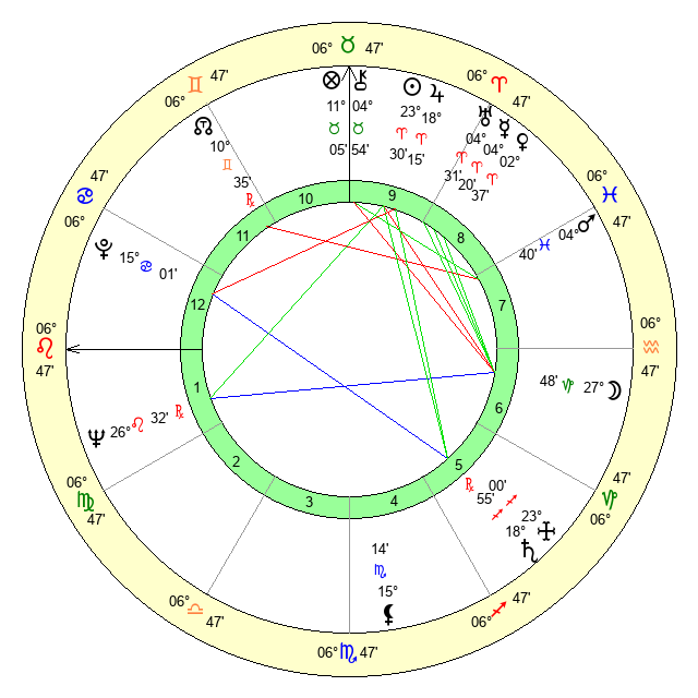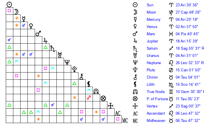 | Sun | 23 Aries 31 | 24 Aries 1 | 26 Cancer 44 |