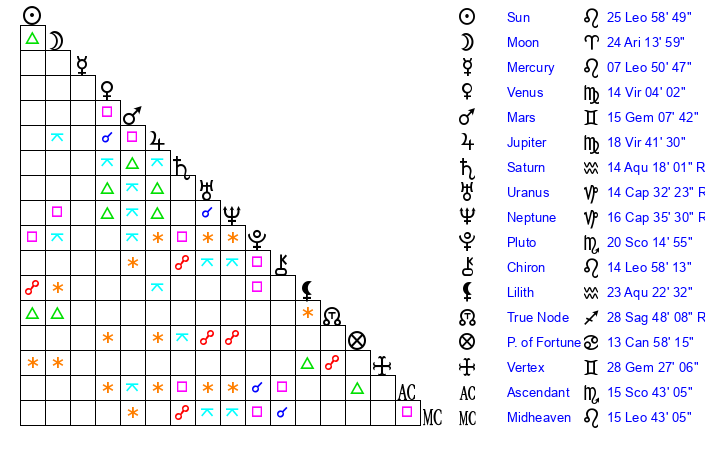 | Mercury | 7 Leo 51 | 7 Leo 28 | 2 Libra 37 |