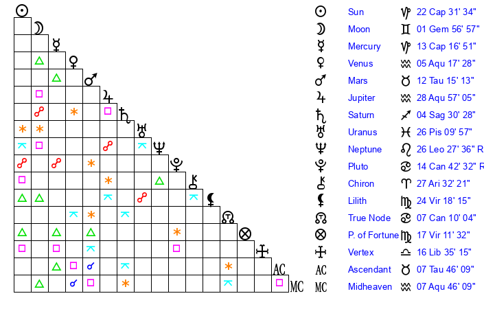 | Venus | 5 Aquarius 18 | 25 Capricorn 12 | 7 Gemini 1 |