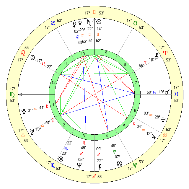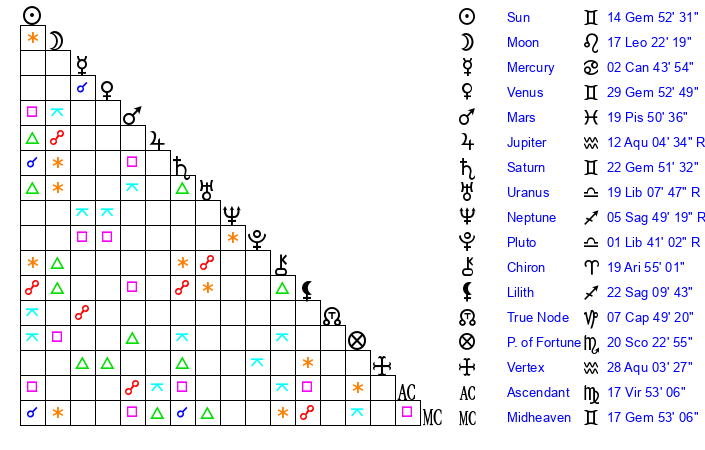 | Sun | 14 Gemini 52 | 15 Gemini 17 | 4 Leo 30 |