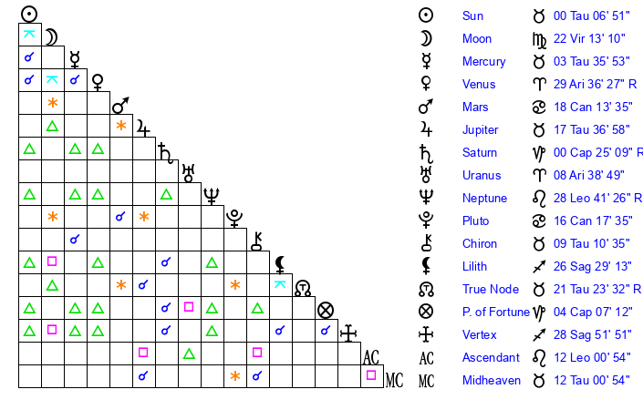 | Sun | 0 Taurus 7 | 0 Taurus 52 | 2 Leo 14 |