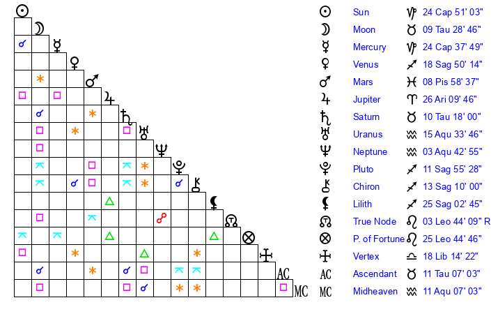 | Saturn | 10 Taurus 6 | 15 Pisces 42 | 10 Taurus 51 |