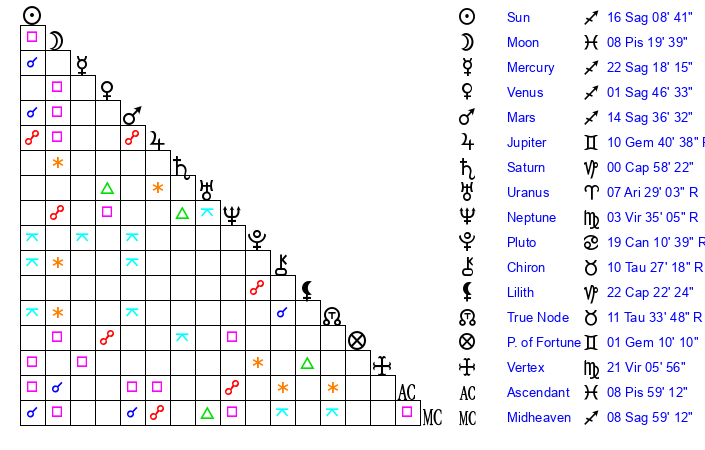 | Sun | 16 Sagittarius 9 | 16 Sagittarius 51 | 23 Pisces 24 |