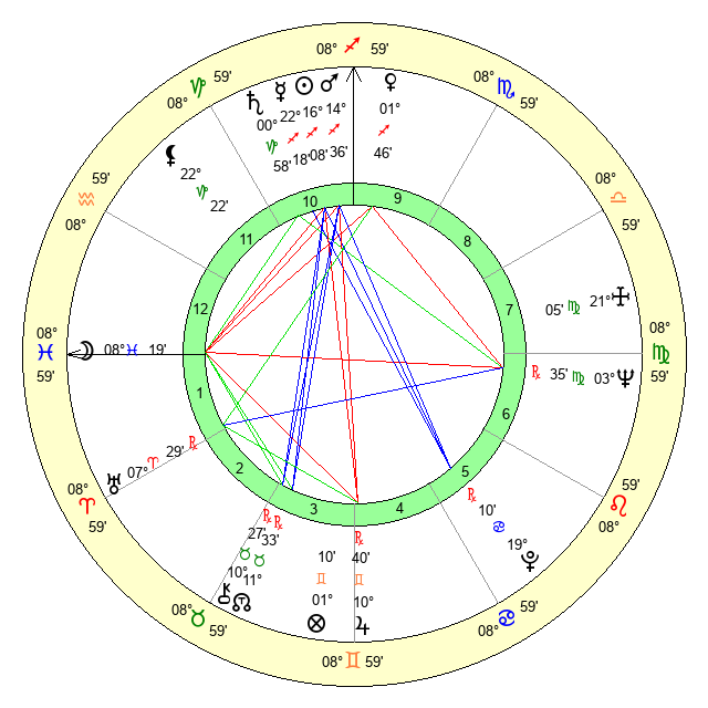 | Neptune | 3 Virgo 35 | 29 Pisces 22 | 1 Virgo 38 |