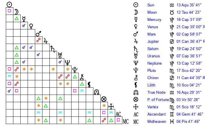 | Sun | 13 Aquarius 35 | 14 Aquarius 6 | 18 Pisces 52 |