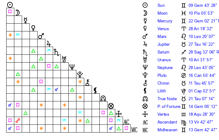 | Sun | 9 Gemini 44 | 10 Gemini 29 | 11 Virgo 39 |