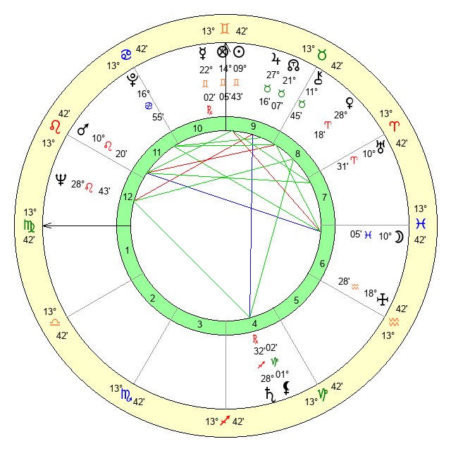 | Moon | 9 Pisces 53 | 11 Leo 44 | 27 Virgo 43 |