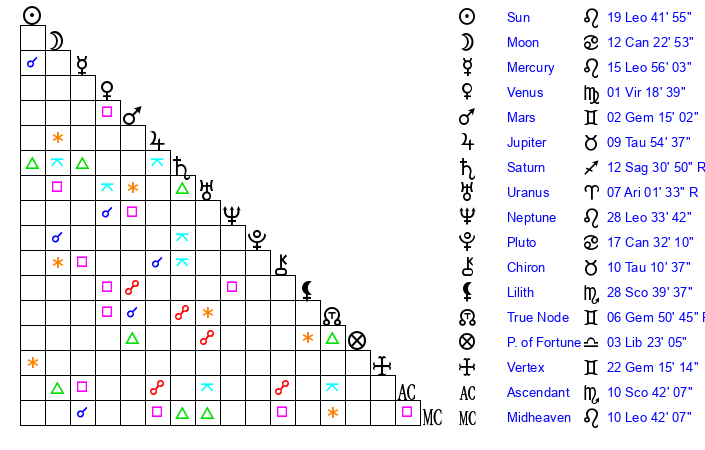 | Neptune | 28 Leo 34 | 1 Aries 46 | 1 Virgo 19 |