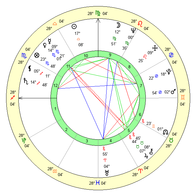 | Moon | 12 Virgo 45 | 7 Gemini 2 | 19 Pisces 5 |