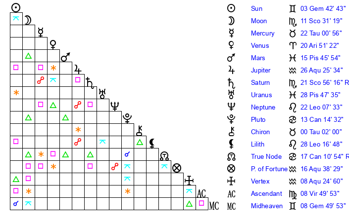 | Jupiter | 26 Aquarius 20 | 26 Gemini 36 | 19 Aquarius 58 |
