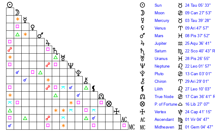 | Moon | 9 Cancer 26 | 28 Sagittarius 30 | 17 Aquarius 10 |
