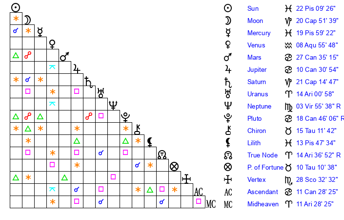 | Pluto | 18 Cancer 46 | 3 Aquarius 12 | 19 Cancer 42 |
