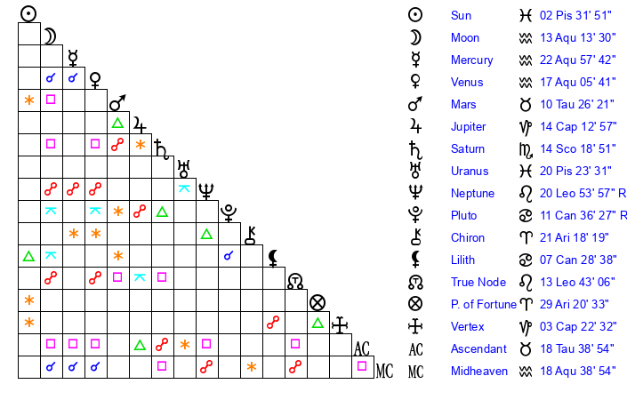 | Mercury | 22 Aquarius 58 | 13 Pisces 16 | 21 Taurus 7 |