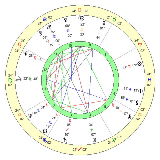 | Sun | 22 Gemini 23 | 22 Gemini 56 | 27 Leo 23 |