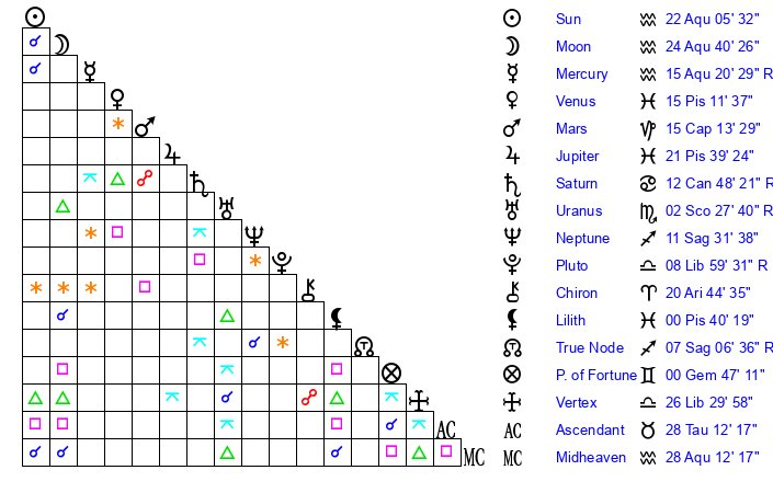 Sun | 22 Aquarius 5 | 22 Aquarius 58 | 12 Aries 5 |