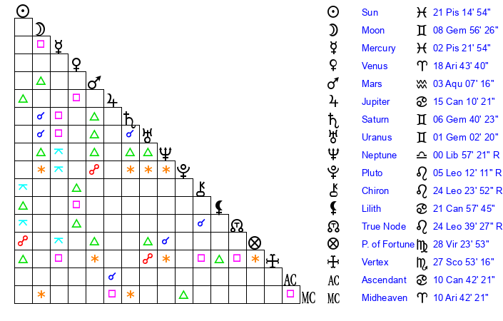 | Moon | 9 Gemini 0 | 4 Virgo 33 | 8 Gemini 28 |